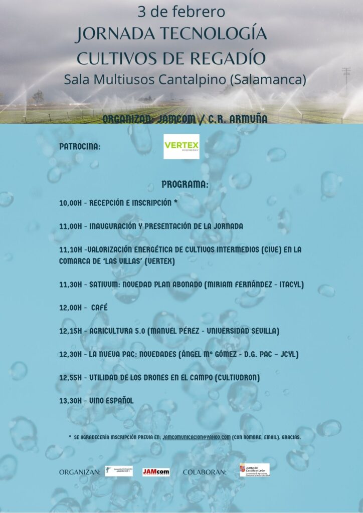 La agricultura 5.0, las novedades de la PAC y el proyecto de biocombustibles de Vertex protagonizaron la jornada ‘Tecnología en cultivos de regadío‘, que JamCom organizó el 3 de febrero en la Sala Teatro de Cantalpino (Salamanca), en colaboración con la Comunidad de Regantes de La Armuña.