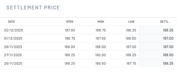 Evolución semanal estabilizada del maíz en el Euronext, manteniéndose, a 188,25 el día 2 de diciembre, el mismo precio que se fijó el 25 de noviembre.