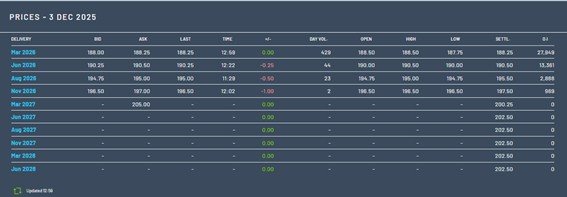 Para los contratos de marzo de 2027, el precio se ha mantenido también en los 200,25 euros/Tm fijados hace una semana.
