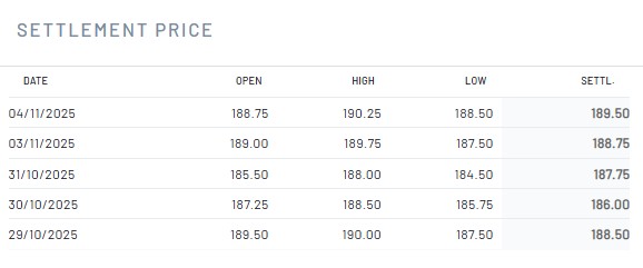 Evolución semanal positiva del maíz en el Euronext, en la que el mercado ha incrementado el precio 1 euro, desde los 188,5 euros del 29 de octubre hasta los 189,5 euros/Tm del día 4 de noviembre.