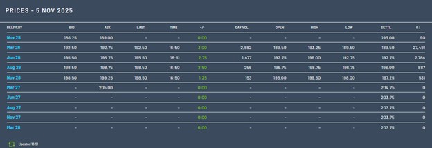 En los futuros del maíz en París, para los contratos de marzo de 2026, el precio semanal se fijó en 189,5 euros/Tm el 5 de noviembre, repitiendo el precio de hace una semana.