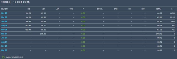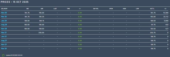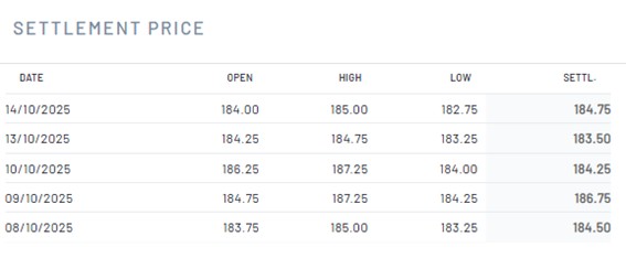En el Mercado de Futuros de París, el contrato de noviembre de 2025 subió 0,75 euros, hasta 184,75 €/Tm, mientras que el de noviembre de 2026 aumentó 0,5 euros, hasta 195,5 €/Tm.