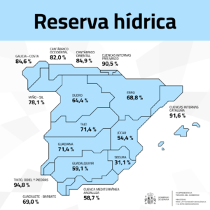 Los embalses almacenan actualmente 37.706 hectómetros cúbicos (hm³) de agua, aumenta durante este período en 4.516 hm³ (el 8,1 % de la capacidad total de los embalses).