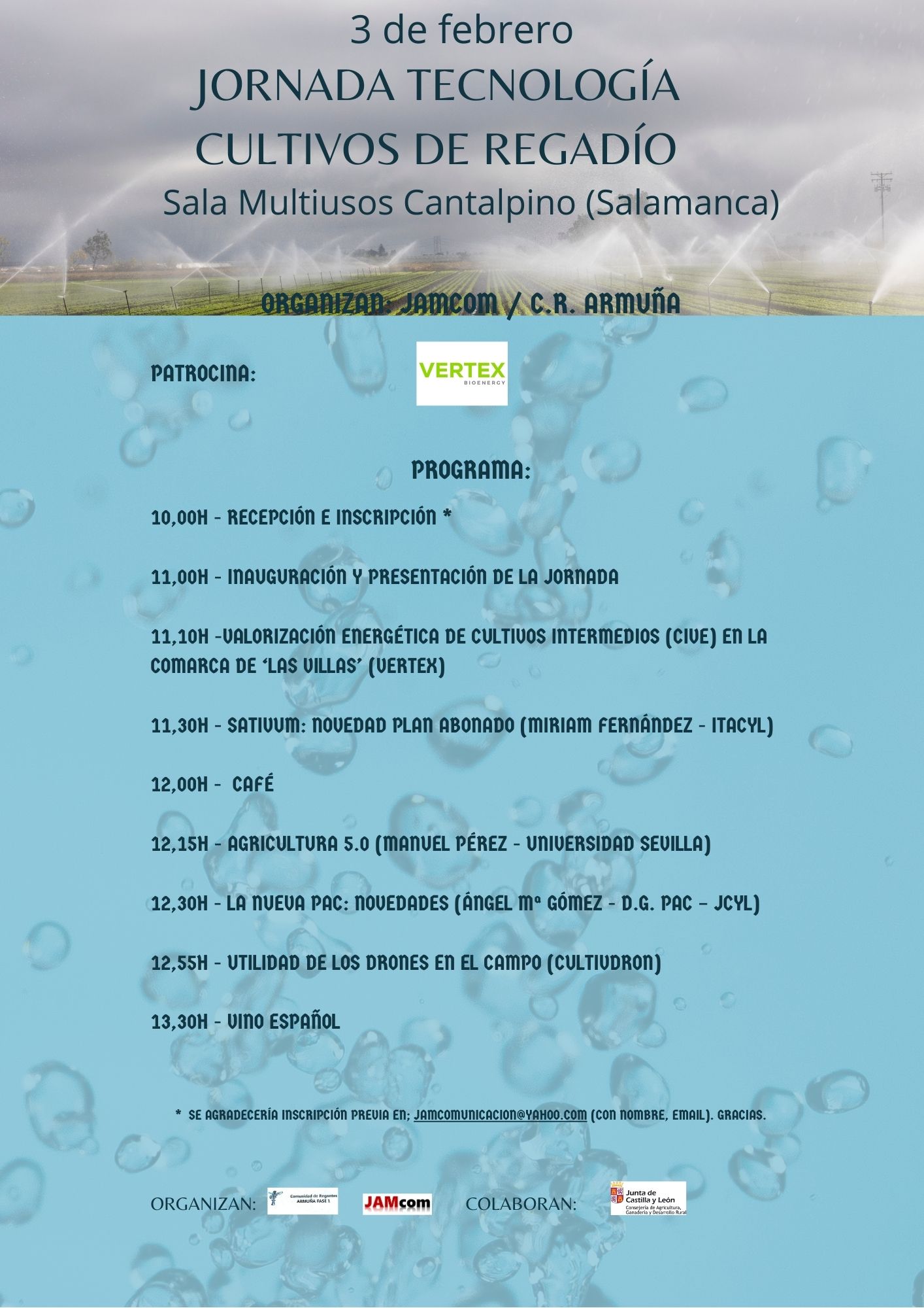 La agricultura 5.0, las novedades de la PAC y el proyecto de biocombustibles de Vertex protagonizan protagonizarán la jornada ‘Tecnología en cultivos de regadío‘, que JamCom organiza en la mañana del 3 de febrero en la Sala Multiusos de Cantalpino (Salamanca), en colaboración con la Comunidad de Regantes de La Armuña.