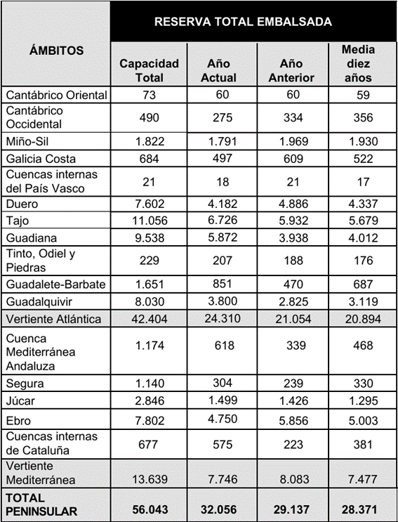 La situación de las cuencas, en hectómetros cúbicos, se detalla en el cuadro adjunto: